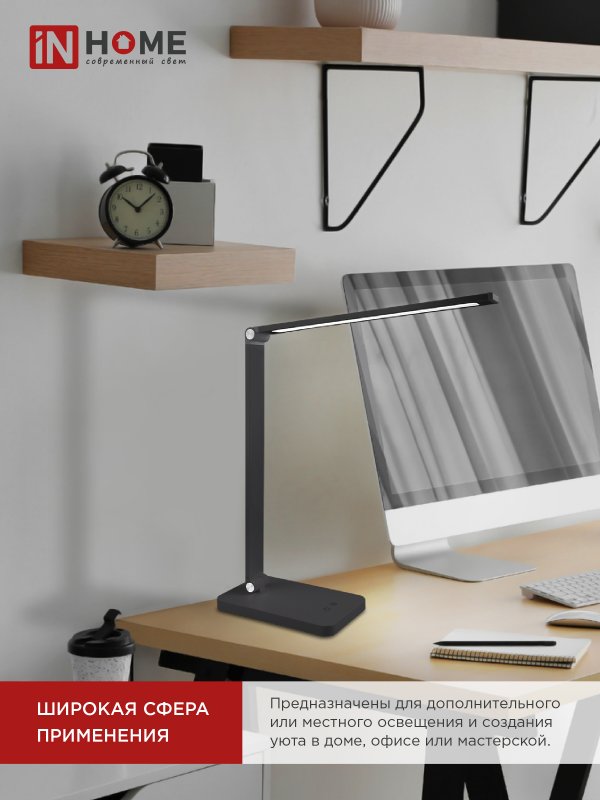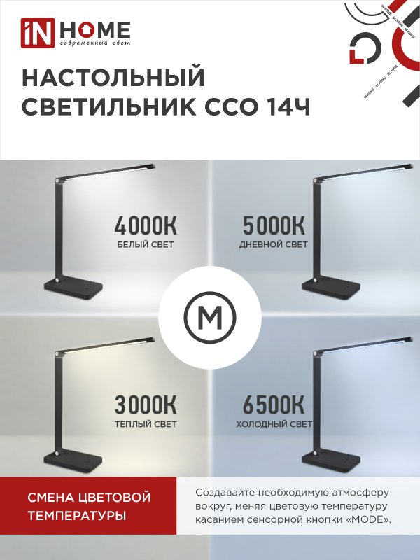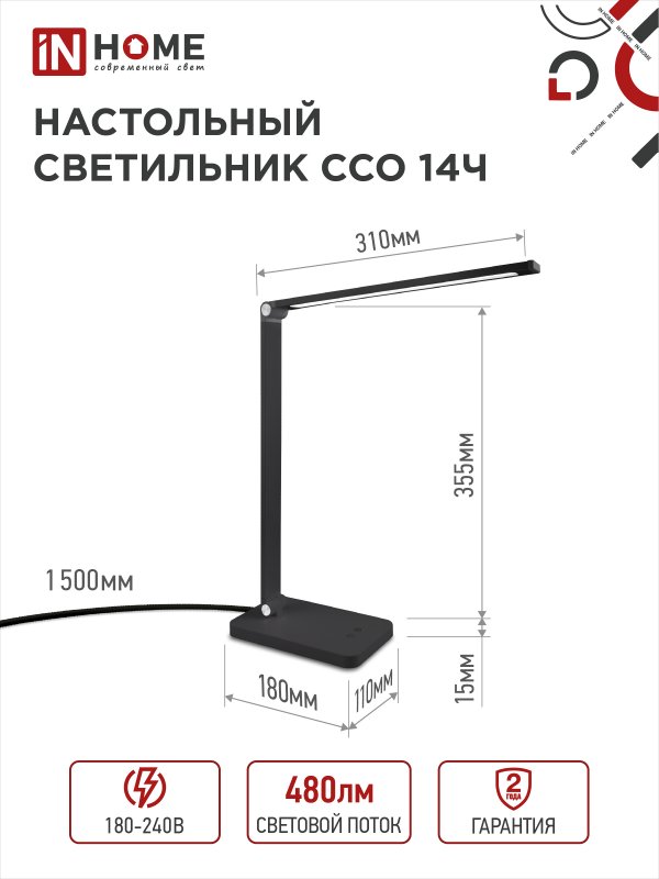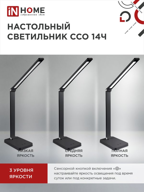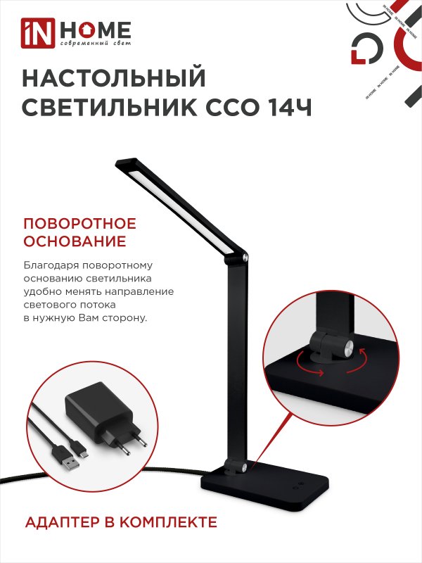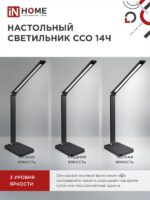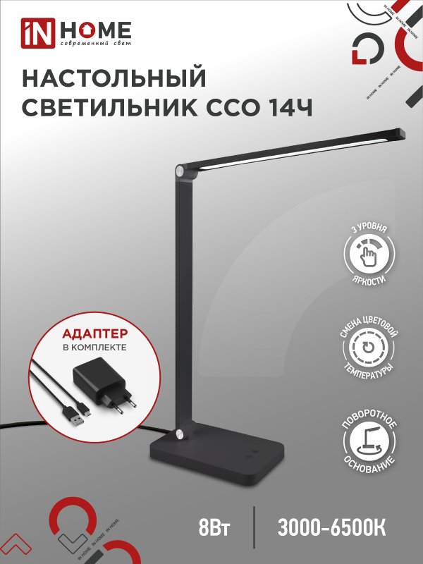 Характеристики Светильник настольный светодиодный PLUS ССО-14Ч 8Вт 480Лм, сенсор, адаптер ЧЕРНЫЙ IN HOME: