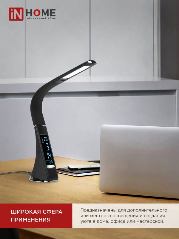 Характеристики Светильник настольный светодиодный PLUS ССО-15Ч 8Вт 480Лм, сенсор, часы, календарь, температура, адаптер ЧЕРНЫЙ IN HOME: