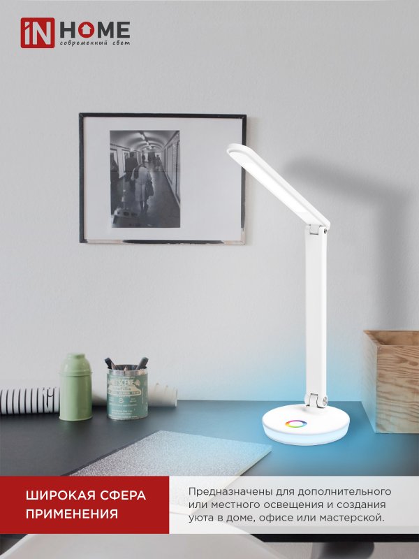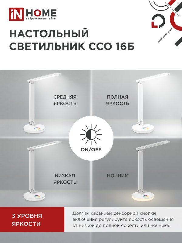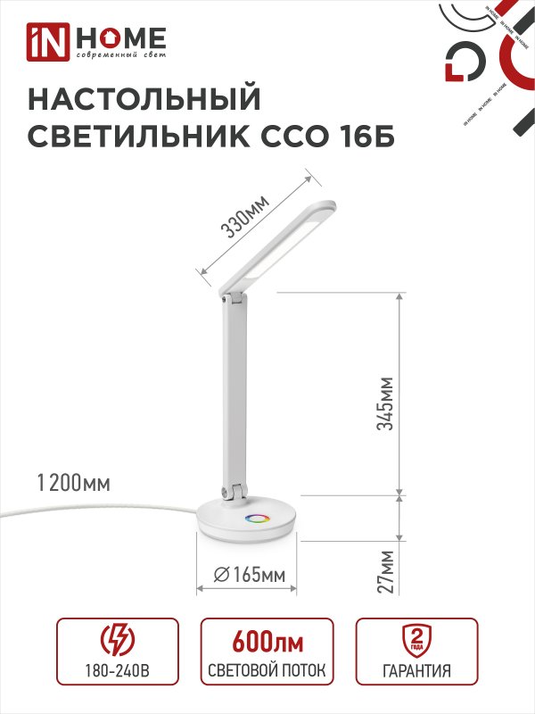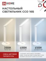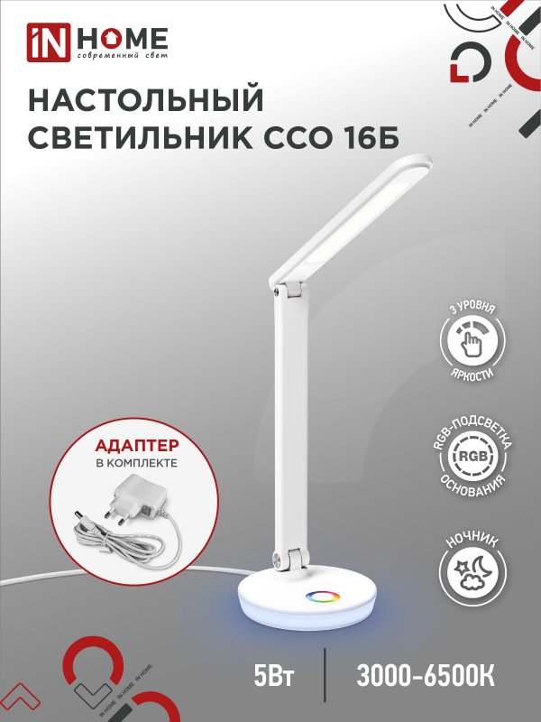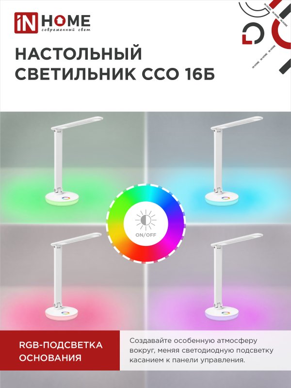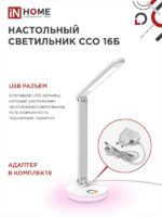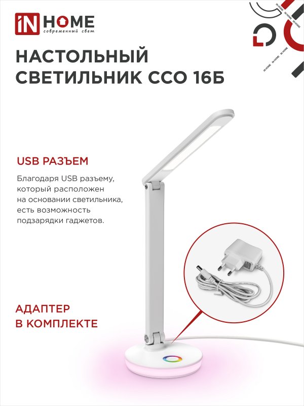 Характеристики Светильник настольный светодиодный PLUS ССО-16Б 12Вт 600Лм RGB, сенсор, USB разъем, адаптер БЕЛЫЙ IN HOME: