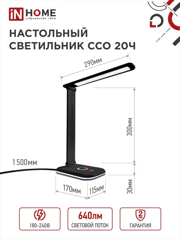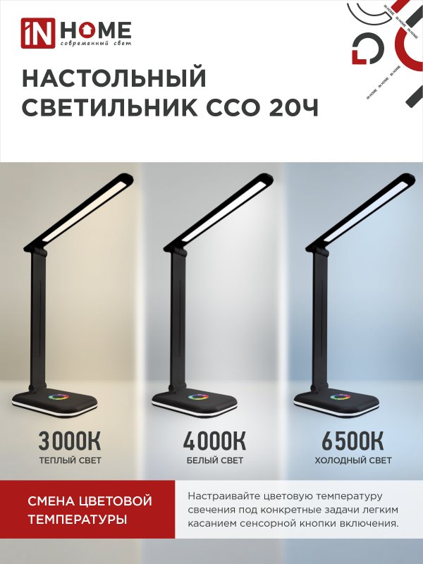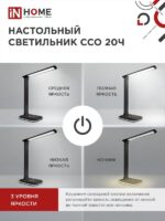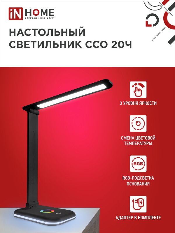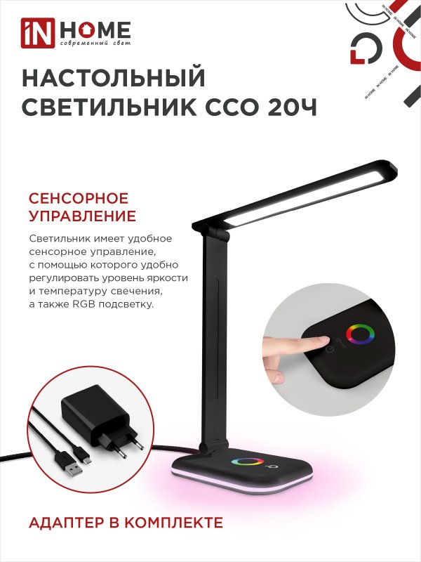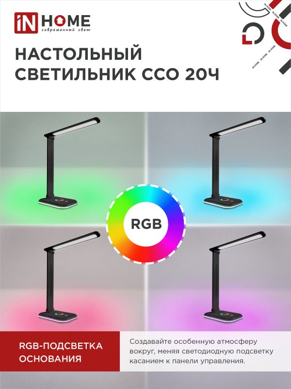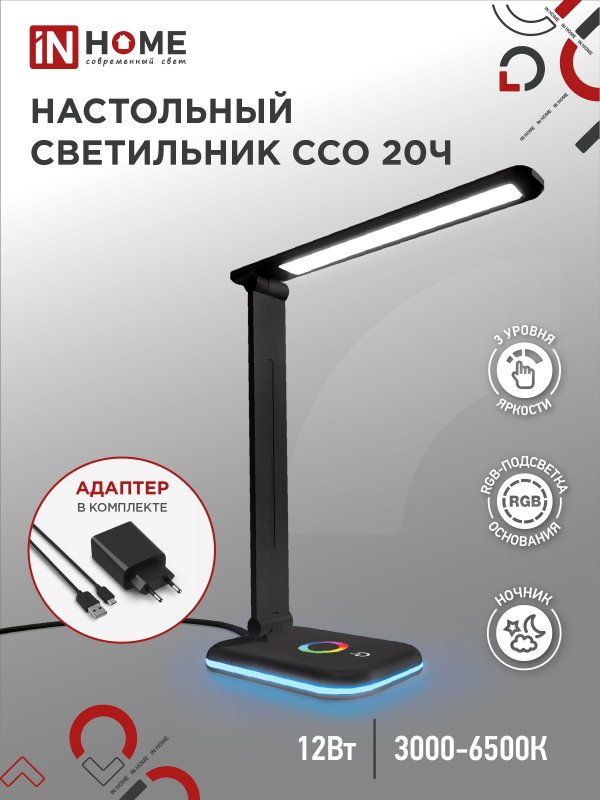 Назначение и применение Светильник настольный светодиодный PLUS ССО-20Ч 12Вт 6500К 640Лм RGB-подсветка, сенсор, с адаптером ЧЕРНЫЙ IN HOME