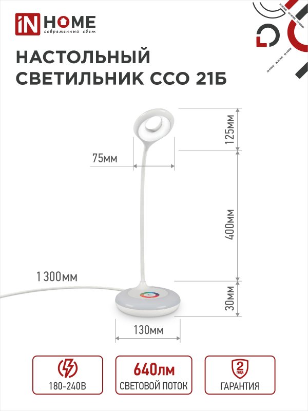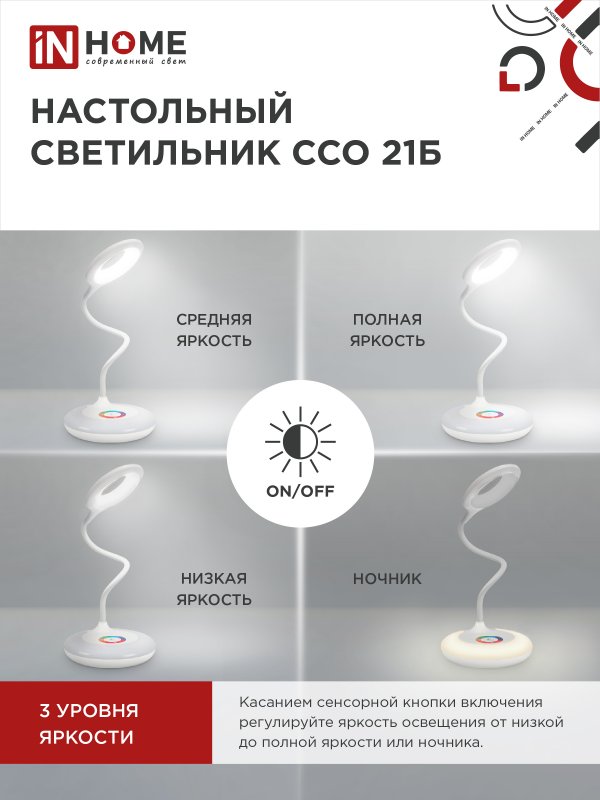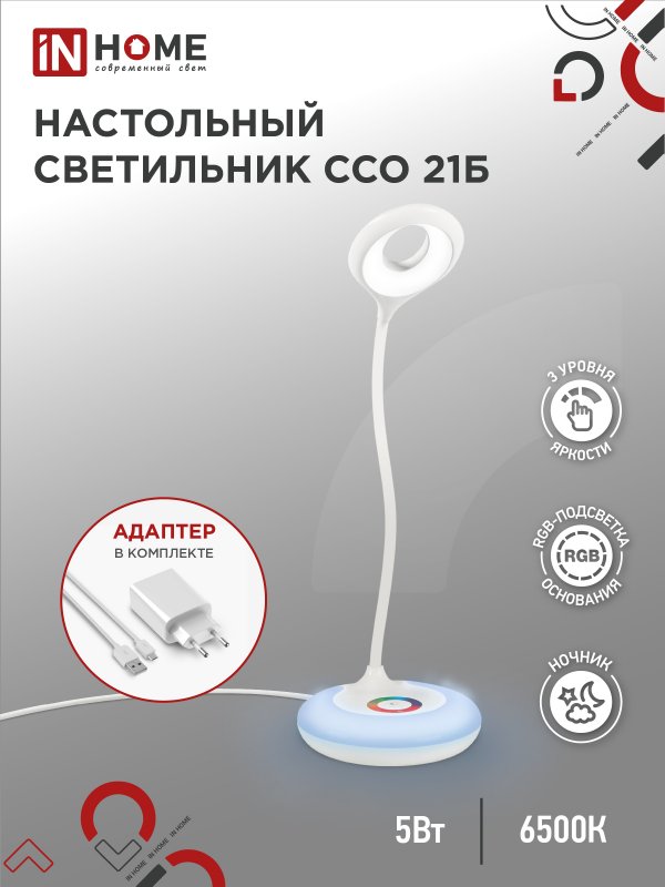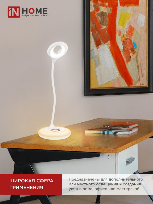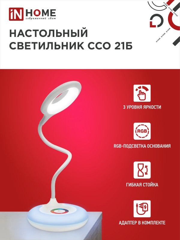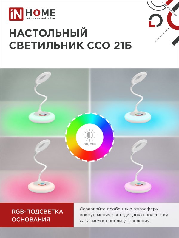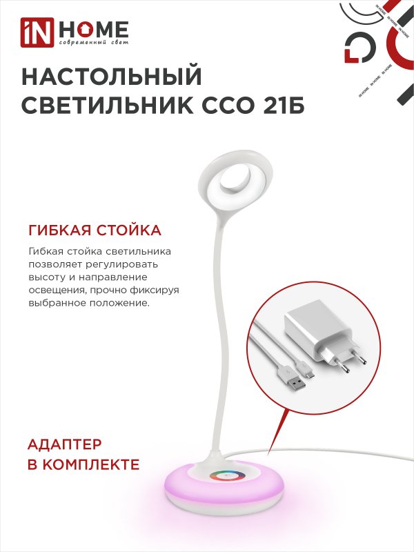 Назначение и применение Светильник настольный светодиодный PLUS ССО-21Б 8Вт 640Лм RGB, сенсор, адаптер БЕЛЫЙ IN HOME