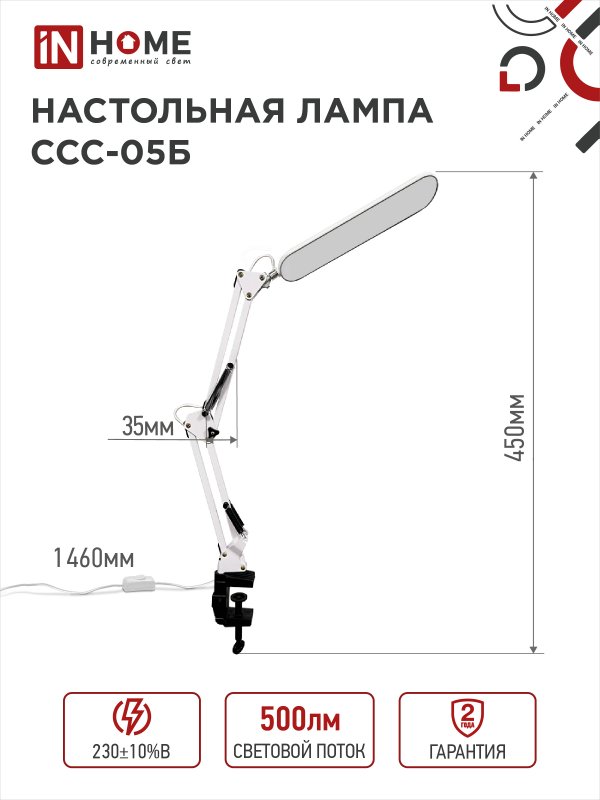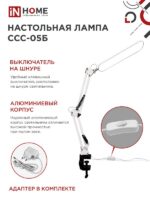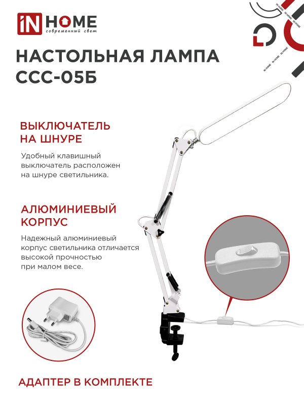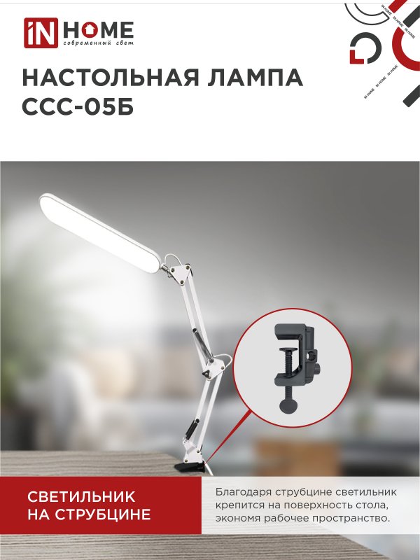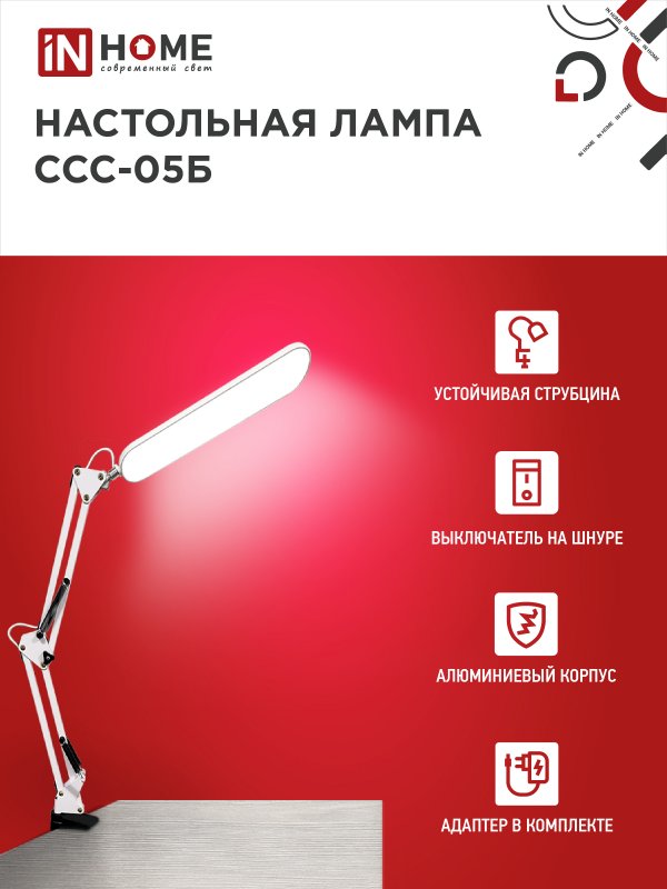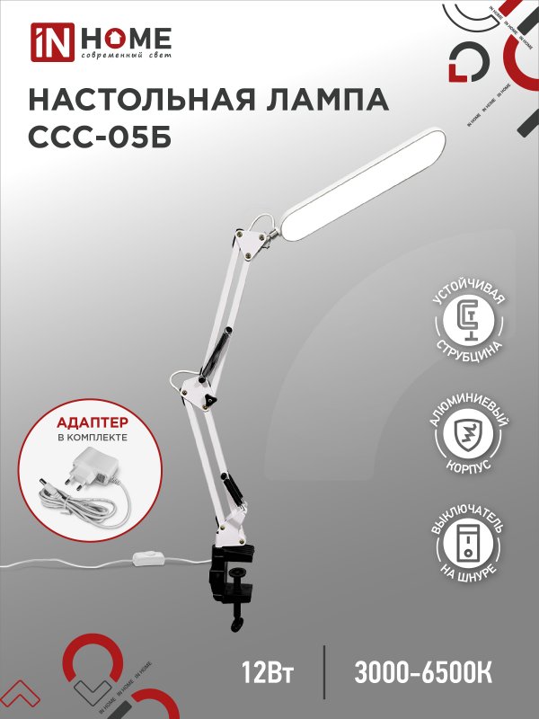 Характеристики Светильник настольный светодиодный PLUS ССС-05Б 12Вт 6500К 500Лм, USB, с адаптером, на струб БЕЛЫЙ IN HOME:
