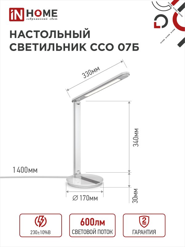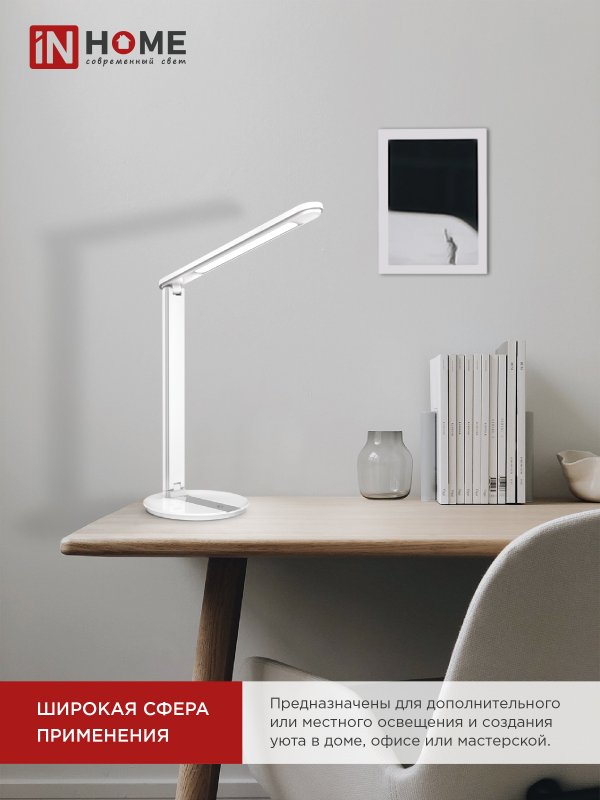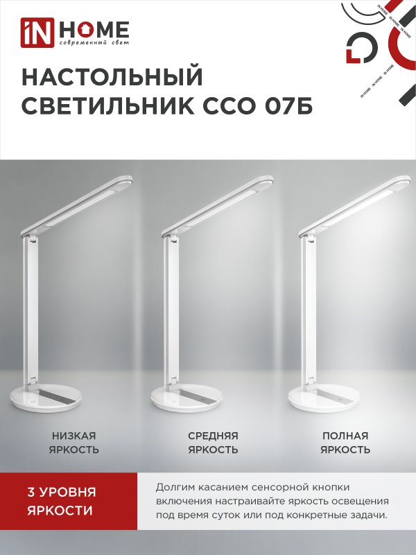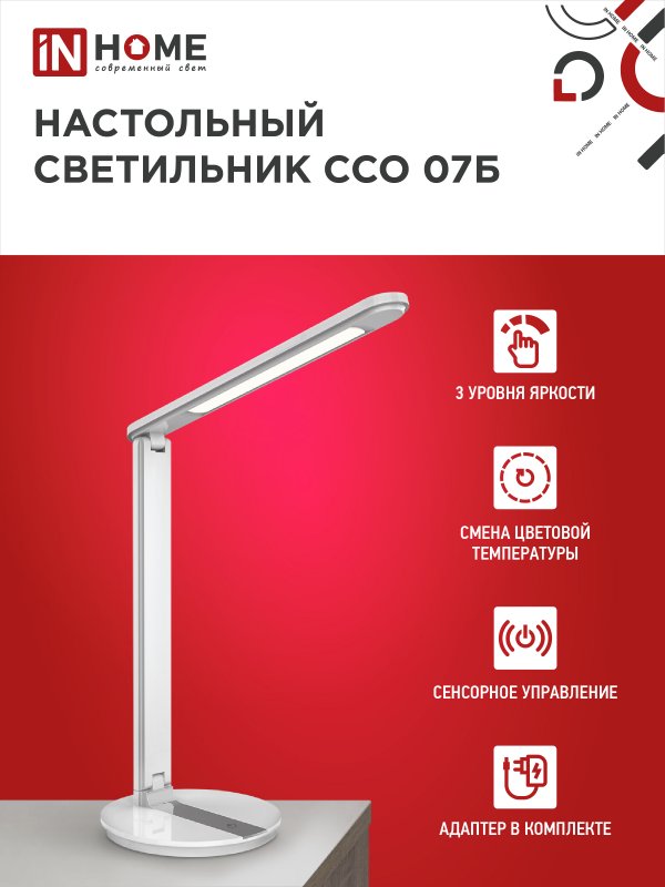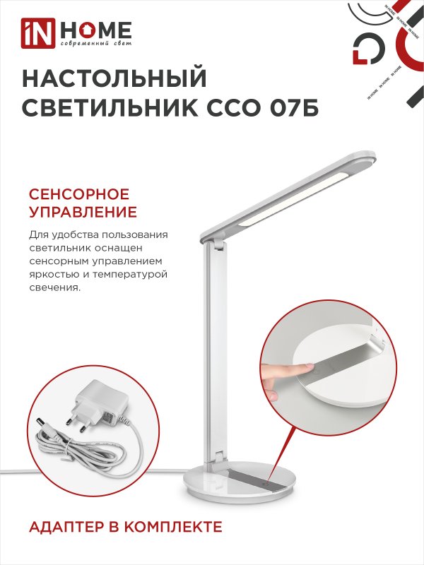Характеристики Светильник настольный светодиодный SIMPLE ССО-07Б 12Вт 600Лм сенсор, адаптер БЕЛЫЙ IN HOME: