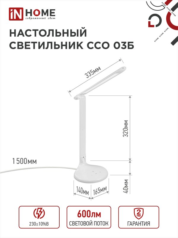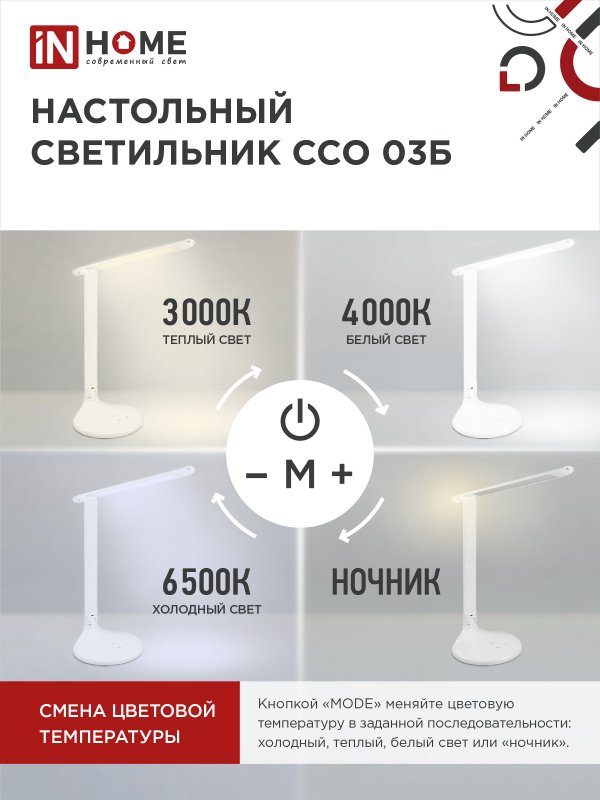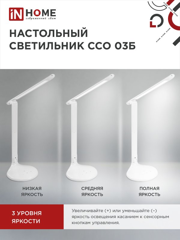 Экономичный и удобный настольный светодиодный светильник с сенсорным диммером ССО-03 ТМ IN HOME предназначен для дополнительного освещения. Удобное сенсорное управление позволяет регулировать уровень яркости светового потока. Современные технологии светильника гарантируют высокую экономичность, экологическую безопасность, надежность конструкции и комфорт для зрения. Чистые линии дизайна и классические цвета корпуса позволяют вписать светильник как в домашнюю обстановку, так и в строгую атмосферу офиса. Функция "ночник" будет приятным дополнением функционального светильника ССО-03. Питание светильников ССО-03 осуществляется от бытовой электросети 230В. Адаптер входит в комплект