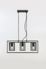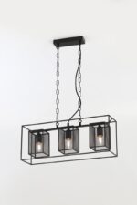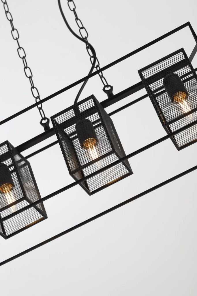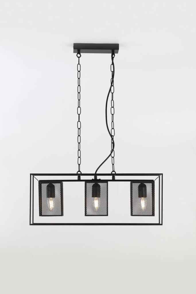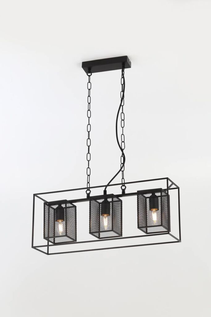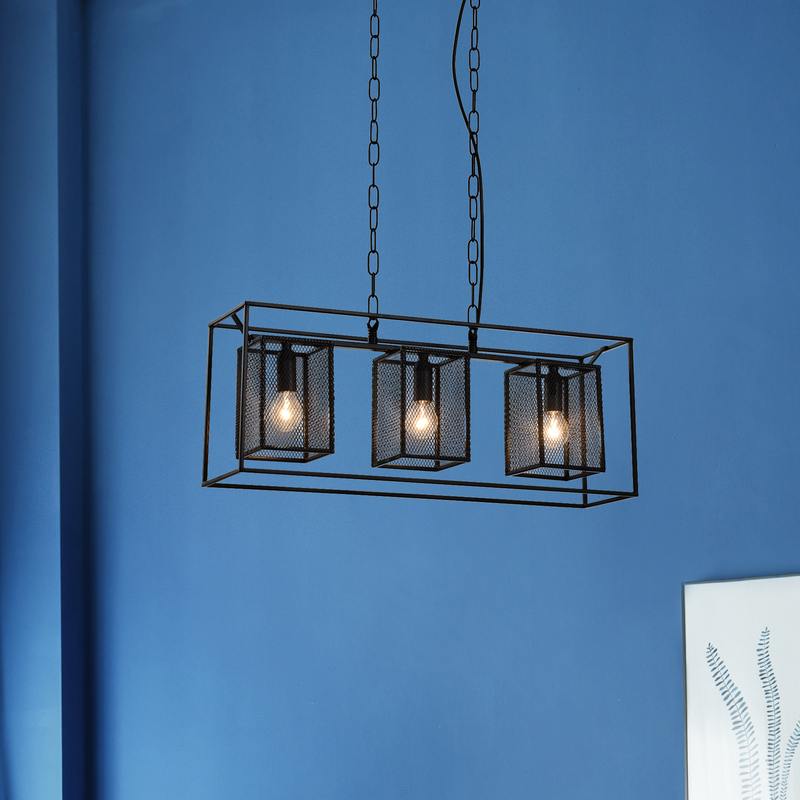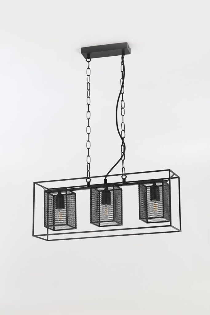 Металлический подвесной светильник Rivoli Michaela создан для интерьеров в стиле лофт, кантри, эффектно смотрится в загородных домах. Лаконичный прямоугольный каркас держит три сетчатых плафона. Высоту подвеса, декорированного цепями, можно изменять.