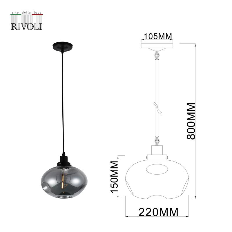 Подвесной светильник Rivoli Sabina (арт. 5134-201) с дымчатым стеклянным абажуром. Светильники потолочные итальянского бренда Rivoli отличаются изысканным дизайном, соответствующим современным трендам оформления интерьеров. Данный подвесной светильник с красивым выдувным плафоном из стекла может применяться как основная люстра или в качестве дополнительного освещения — как подвесной светильник над столом, подвесной светильник над барной стойкой, подвесной светильник в прихожей. Тонированный плафон смягчает световые блики. Трос базового черного цвета может быть отрегулирован по высоте при монтаже подвесного светильника-люстры. Рекомендованная лампа — Е27 40 Вт.
