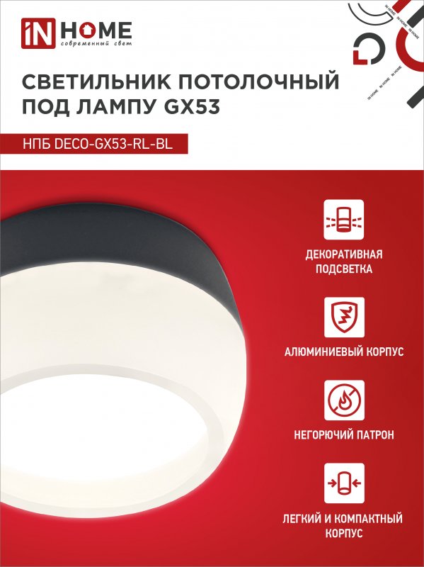 Характеристики Светильник потолочный НПБ DECO-GX53-RL-BL под лампу GX53 90х52мм черный IN HOME: