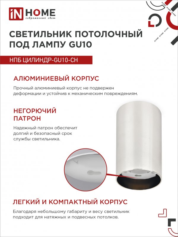 Характеристики Светильник потолочный НПБ ЦИЛИНДР-GU10-CH под лампу GU10 55х100мм хром IN HOME: