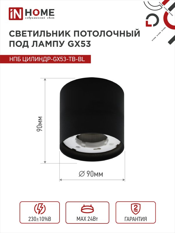 Характеристики Светильник потолочный НПБ ЦИЛИНДР-GX53-TB-BL под лампу GX53 90х90мм черный IN HOME: