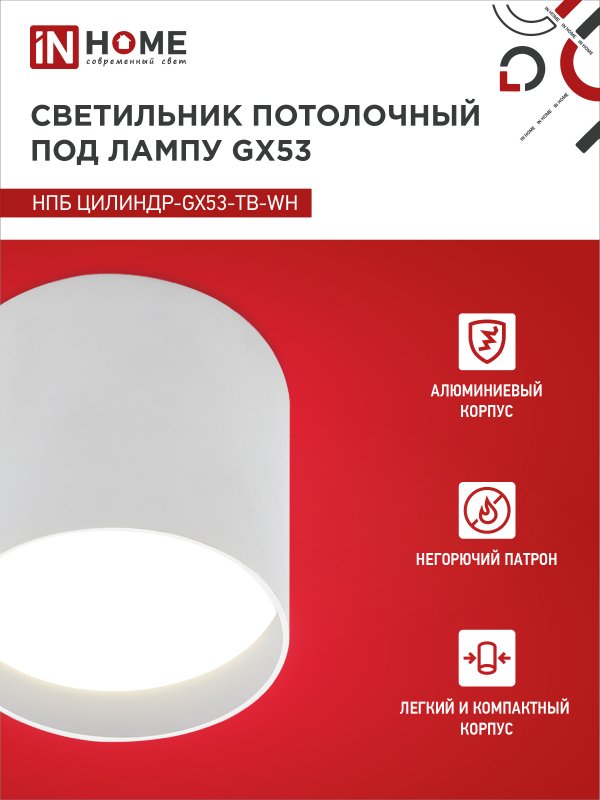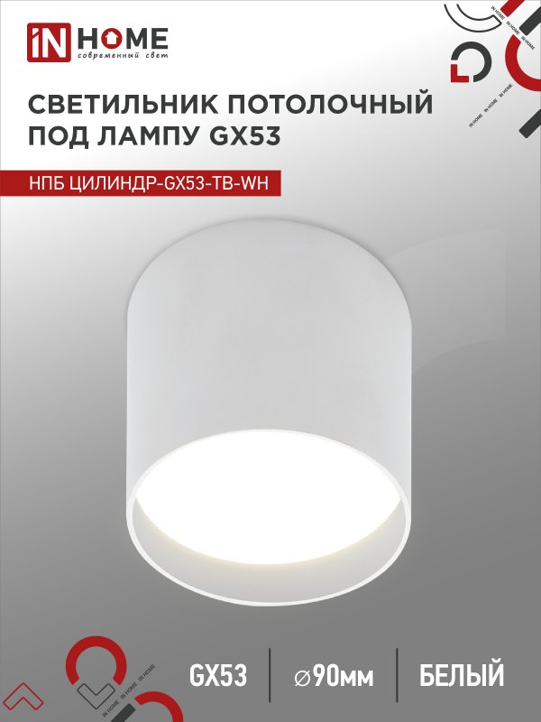 Характеристики Светильник потолочный НПБ ЦИЛИНДР-GX53-TB-WH под лампу GX53 90х90мм белый IN HOME: