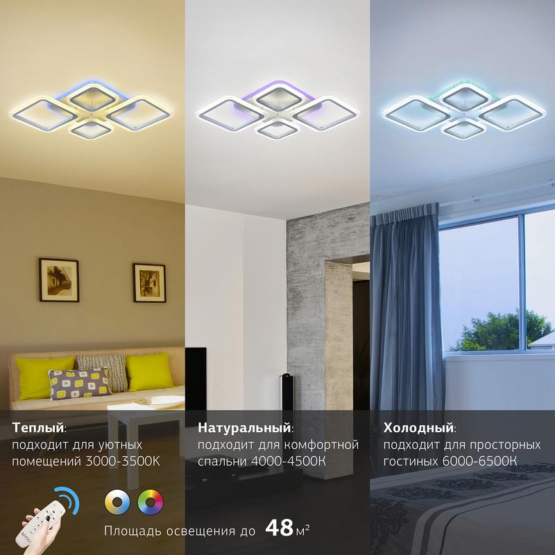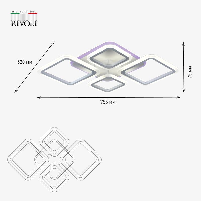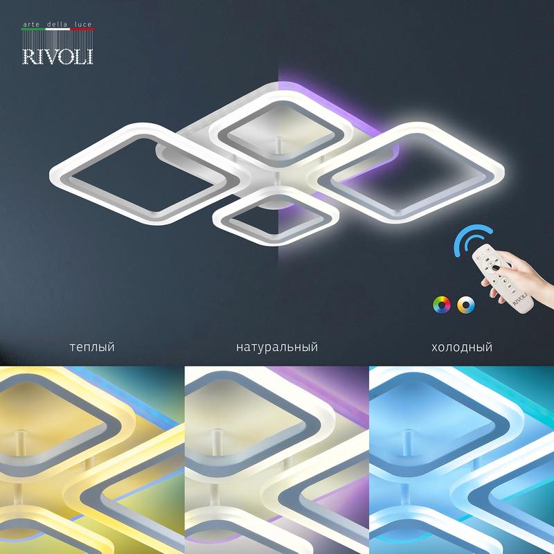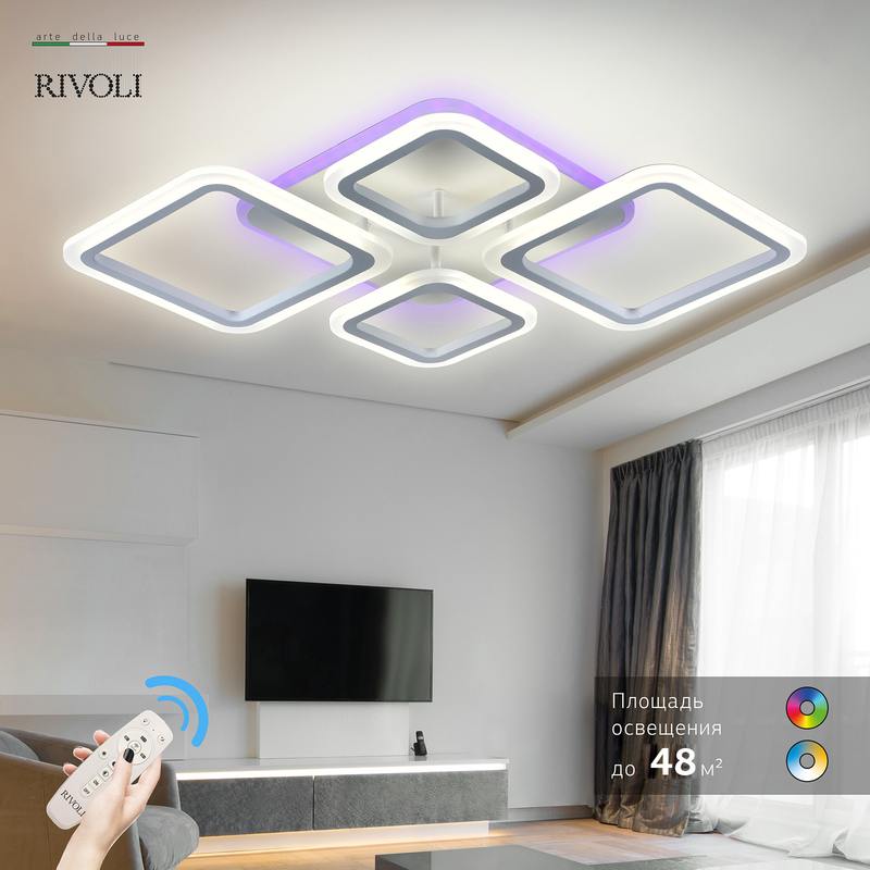 Rivoli Filicitas (арт. 6051-104) — светильник потолочный светодиодный с пультом дистанционного управления, регулирующим яркость, цветовую температуру и RGB-подсветку. Доступно управление через смартфон.