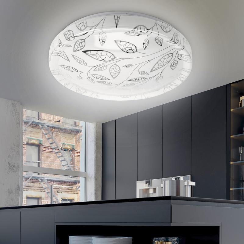 Плафон LED люстры декорирован изящным узором. Нежные ветки с лепестками гармонично смотрятся на круглом плоском корпусе. Такой светильник прекрасно подойдет для оформления гостиной, коридора, спальни или детской.