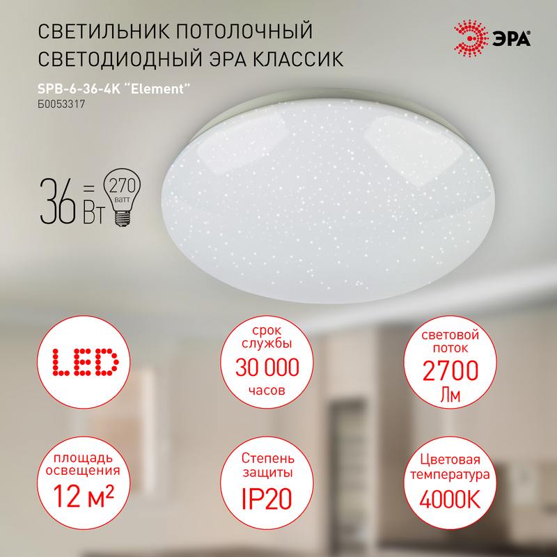 Характеристики Светильник потолочный светодиодный ЭРА Классик без ДУ SPB-6-36-4K Element 36Вт 4000К 2700лм:
