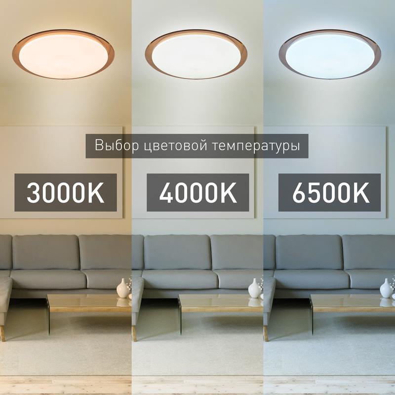В комплекте с потолочным светильником идет пульт управления, с помощью которого происходит регулировка времени отключения (через 30 мин или 1 ч), яркости и цветовой температуры (от 3000 К до 6500 К). Круглый потолочный светильник работает на светодиодах, которые снижают нагрузку на электросеть и не требуют замены. Не менее приятно, что в люстре также есть ночной режим, который светит на минимальной яркости и заботится о комфорте глаз после темноты.