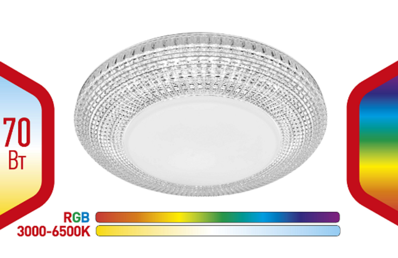 Светильник светодиодный потолочный ЭРА SPB-6-70-RC серии Metz RGB отличается возможностью регулирования яркости светового потока и цветовой температуры. Пульт дистанционного управления имеет крупные кнопки с подсказками, очень удобен в использовании. Светильник можно расположить в уютной гостиной и менять яркость освещения в зависимости от настроения или необходимости. Цветовая температура регулируется в пределах от 4000 К до 6000 К. Диаметр корпуса составляет 50 см. Рассеиватель выполнен в виде сочетания белой матовой части и боковых сторон "под хрусталь" — изящно и утонченно. На стальном корпусе основания располагается светодиодная плата, оснащенная современным и надежным драйвером. Модель снабжена функцией RGB, позволяющую увидеть привычные вещи в необычных цветовых решениях.