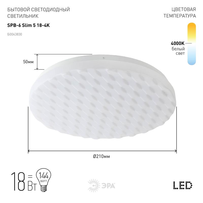 Характеристики Светильник потолочный светодиодный ЭРА Slim без ДУ SPB-6 Slim 5 18-4K 18Вт 4000K: