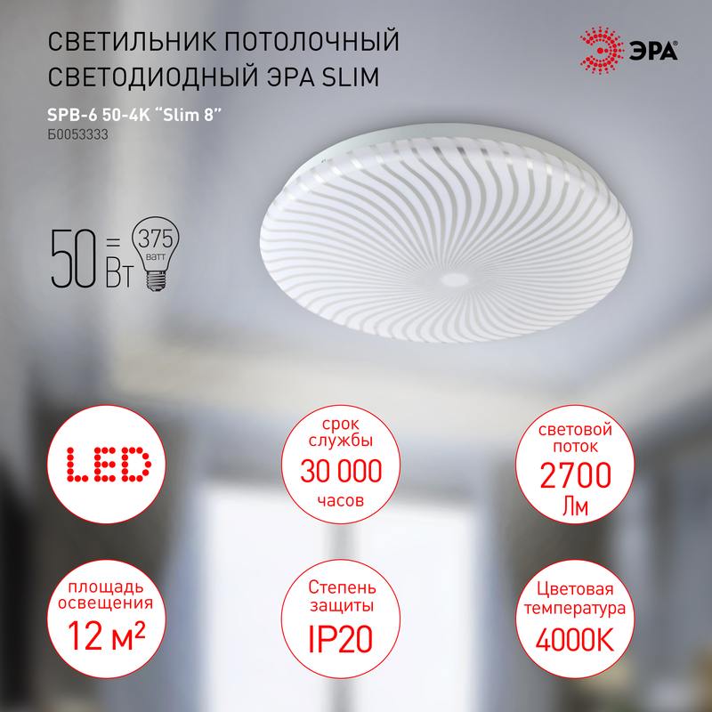 Характеристики Светильник потолочный светодиодный ЭРА Slim без ДУ SPB-6 Slim 8 50-4K 50Вт 4000K: