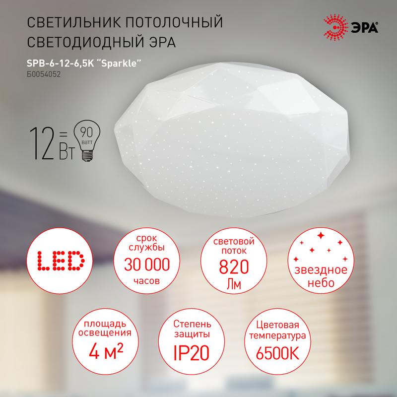 Характеристики Светильник потолочный светодиодный ЭРА SPB-6-12-6,5K Sparkle без ДУ 12Вт 6500K: