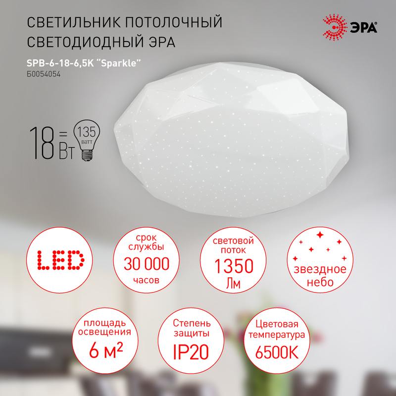 Характеристики Светильник потолочный светодиодный ЭРА SPB-6-18-6,5K Sparkle без ДУ 18Вт 6500K: