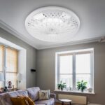 Восхитительный дизайн плафона создаст приятную обстановку в Вашем доме. Узор из переплетающихся линий прекрасно сочетается с круглым плоским корпусом. Крохотные звезды, разбросанные по окружности рассеивателя, придают светильнику динамики. Такая LED люстра идеальна для оформления света детской, гостиной или спальне.