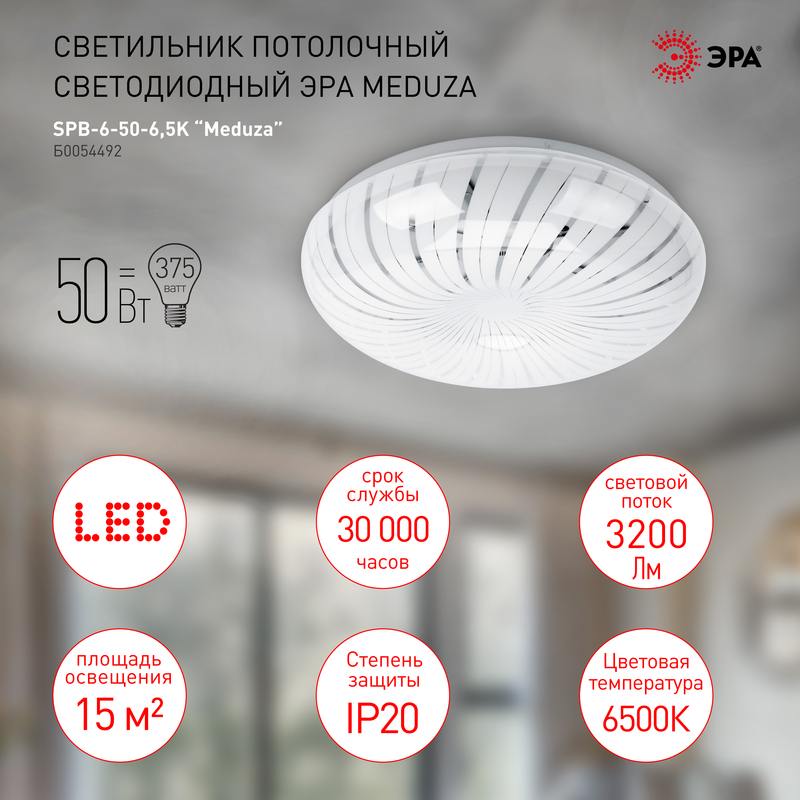 Характеристики Светильник потолочный светодиодный ЭРА SPB-6-50-6.5K Meduza без ДУ 50Вт 6500K: