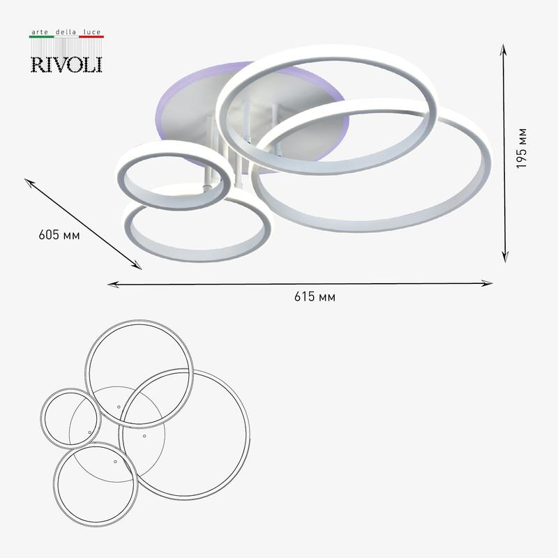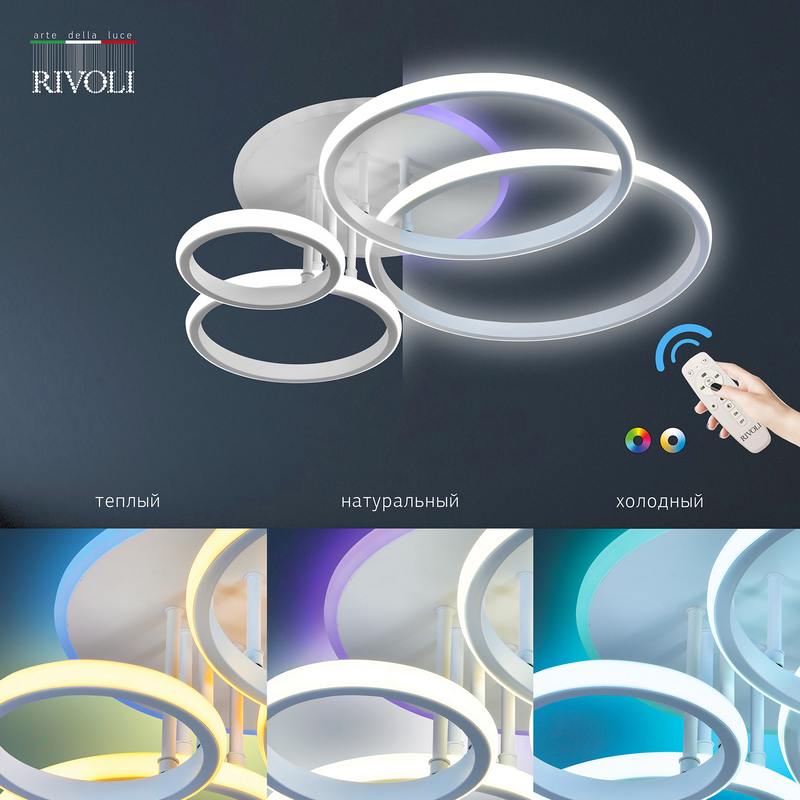 Rivoli Carmen (арт. 6086-103) светильник светодиодный потолочный в металлическом корпусе универсального белого цвета. Функции этой красивой LED-люстры: плавная регулировка яркости, выбор цветовой температуры (3000 6000 К). Имеется разноцветная RGB-подсветка, которую можно использовать вместе с основным освещением или самостоятельно.