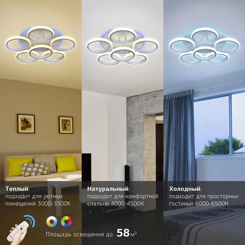 Rivoli Kresenz светодиодный потолочный светильник в стиле модерн. Укомплектован пультом дистанционного управления. Есть возможность управлять освещением также при помощи приложения в смартфоне. Современная LED-люстра Kresenz от итальянского бренда Rivoli новое слово в освещении вашего дома! Теперь вы можете регулировать яркость света, выбирать цветовую температуру (3000 6000 К), а также наслаждаться эффектной RGB-подсветкой.