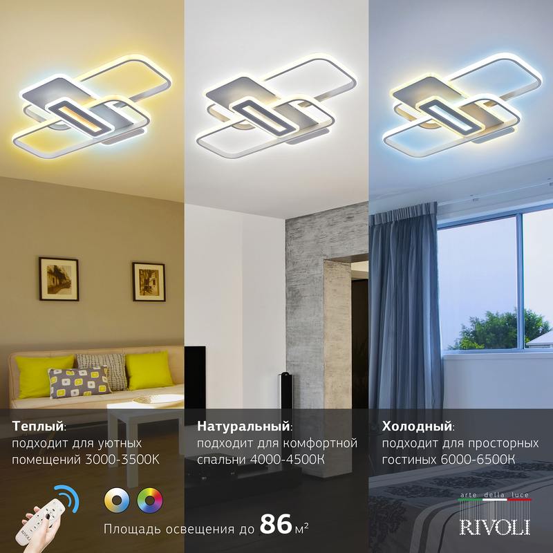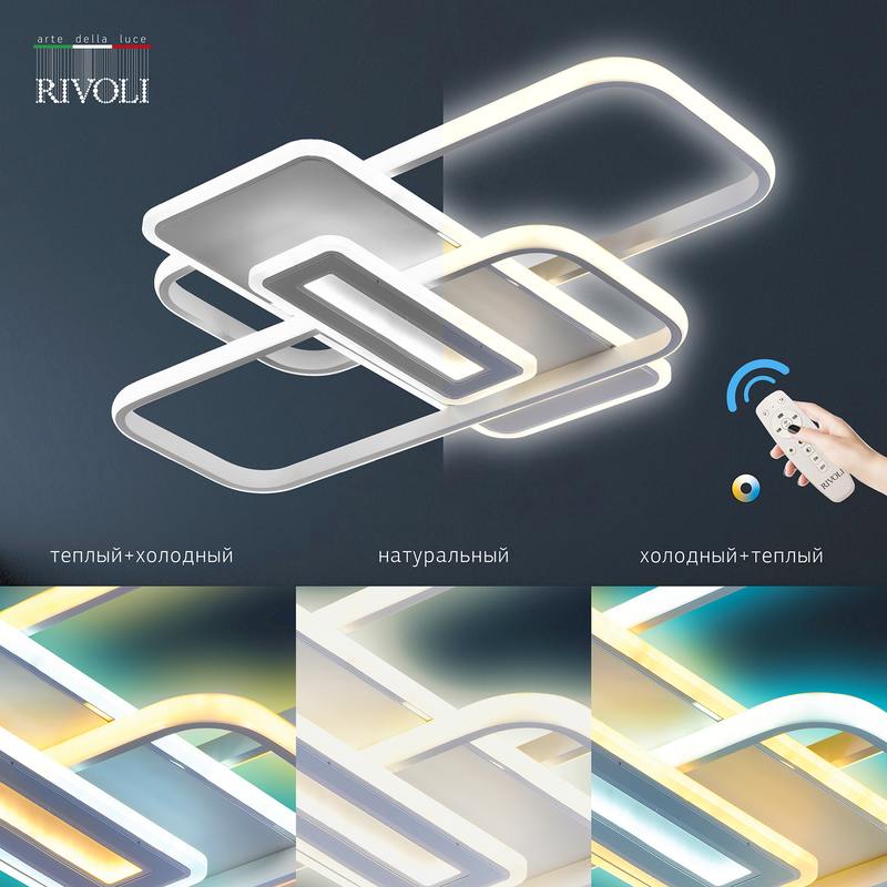 Rivoli Laura светильник потолочный с пультом дистанционного управления и возможностью управления со смартфона. Современный вариант потолочной люстры, который выбирают за удобство в использовании и великолепный внешний вид. Металлический корпус выполнен в базовом белом цвете, что делает данную люстру на потолок универсальной для любого интерьера.