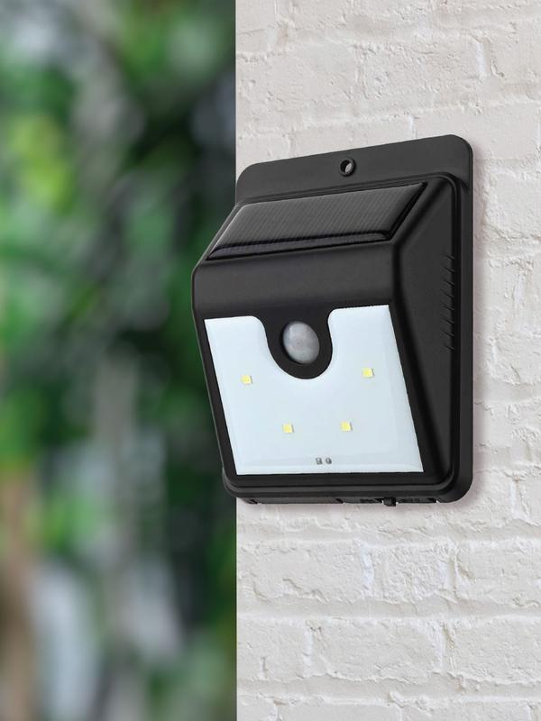Уличный светильник на солнечной батарее с датчиком движения для удобного света на фасаде дома или беседки. Беспроводное устройство в течение дня накапливает энергию на встроенной батарее. В тёмное время суток светильник работает в режиме ночника, а при движении рядом — переключает яркость на 100%. Зона действия датчика — 3м. Датчик света предотвращает включение фонаря днём. Литиевый аккумулятор 3.7В 800мАч. Саморезы для крепления на стену в комплекте
