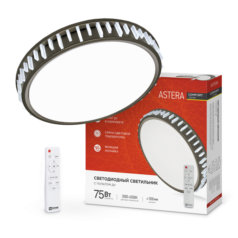Назначение и применение Светильник светодиодный COMFORT ASTERA 75Вт 230В 3000-6500K 6000Лм 500×90мм с пультом ДУ IN HOME