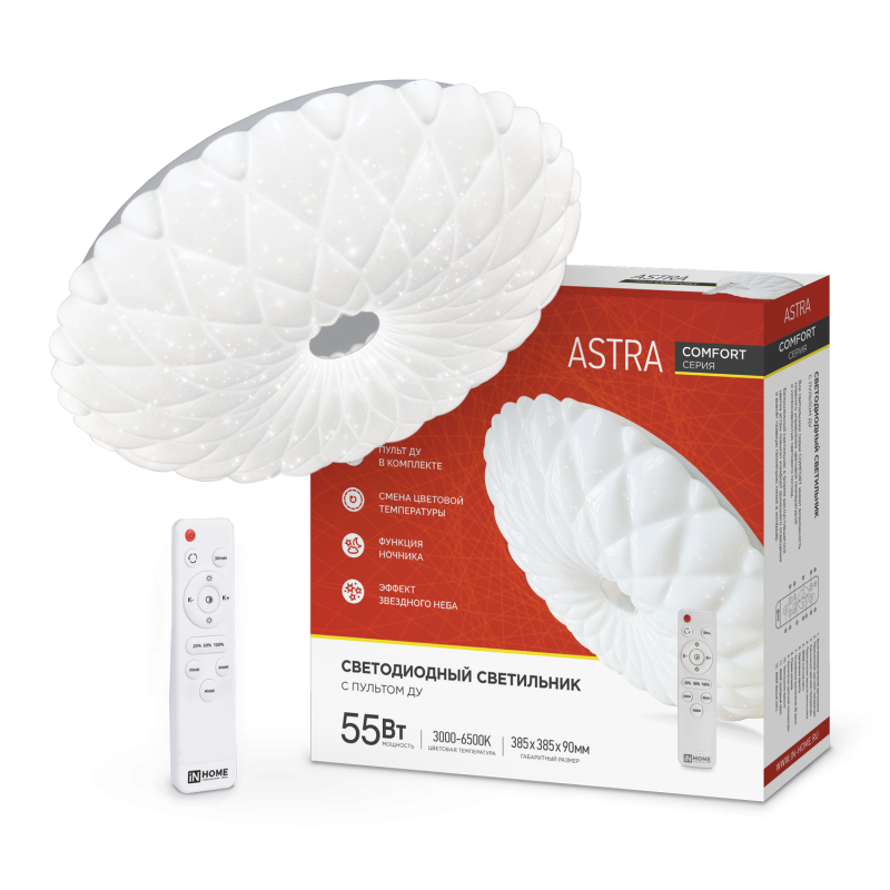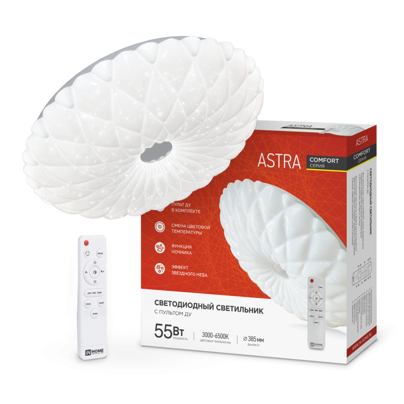 Назначение и применение Светильник светодиодный COMFORT ASTRA 55Вт 230В 3000-6500K 4400Лм 385×90мм с пультом ДУ IN HOME