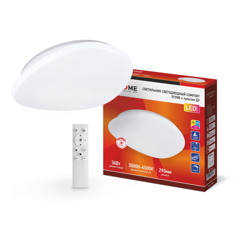 Характеристики Светильник светодиодный COMFORT STONE 36Вт 230В 3000-6500K 2900Лм 290×70мм с пультом ДУ IN HOME: