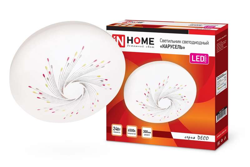 Светодиодные светильники КАРУСЕЛЬ серии DECO ТМ IN HOME в классическом белом матовом корпусе с яркими цветовыми акцентами добавят нотку жизнерадостности в интерьер любого помещения. Линейка светильников КАРУСЕЛЬ представлена в диапазоне мощностей от 12 Вт до 48 Вт, что позволяют подобрать оптимальный осветительный прибор, в зависимости от конфигурации и габаритов помещения. Светодиодные светильники КАРУСЕЛЬ серии DECO предназначены для внутреннего освещения жилых помещений, подъездов и сферы ЖКХ, офисных и административных учреждений, магазинов, а также холлов, коридоров, лестничных пролётов, подсобок и других помещений вспомогательного назначения. Современные светильники серии DECO, работающие на основе последнего поколения светодиодов, обеспечивают яркий равномерный световой поток при максимальной экономии электроэнергии. Отсутствие пульсации гарантирует сохранность здоровья глаз. Светодиодные светильники являются одним из самых экологически безвредных источников света и не требуют специальной утилизации и переработки. Светильники получили сертификат таможенного союза EAC