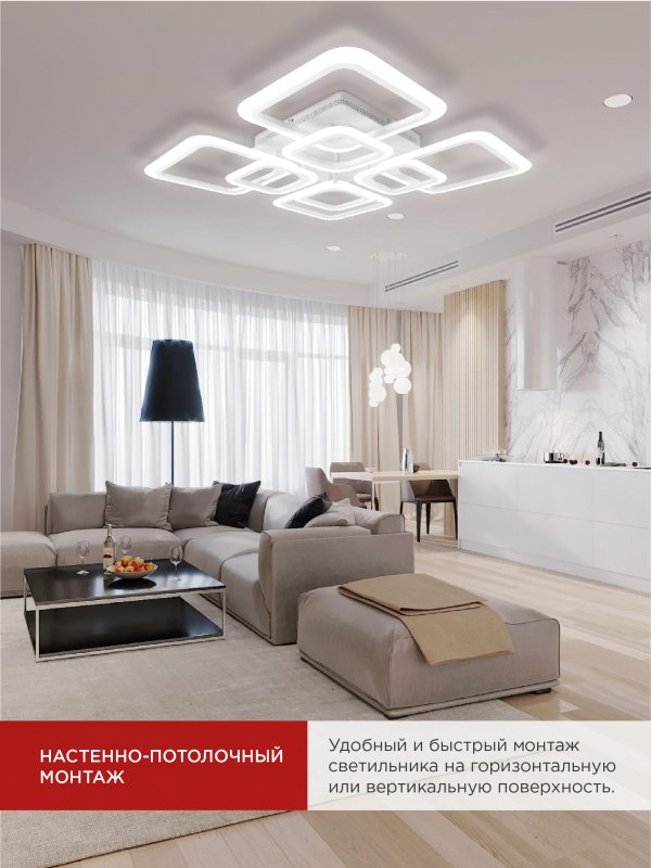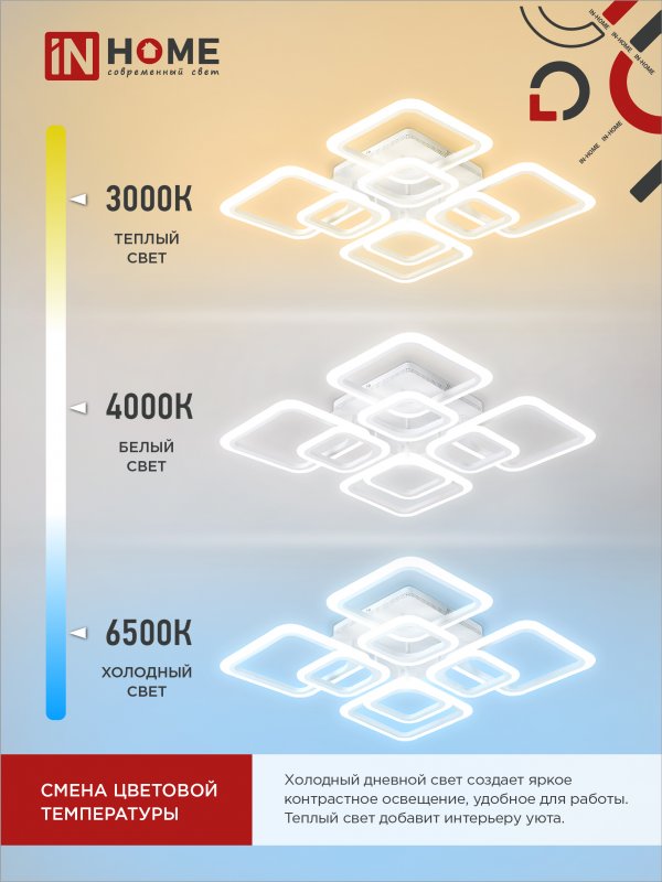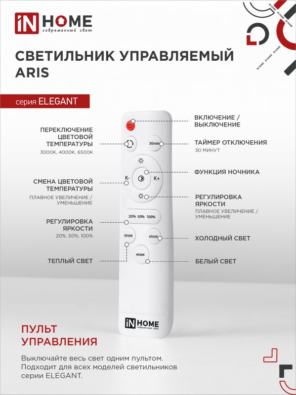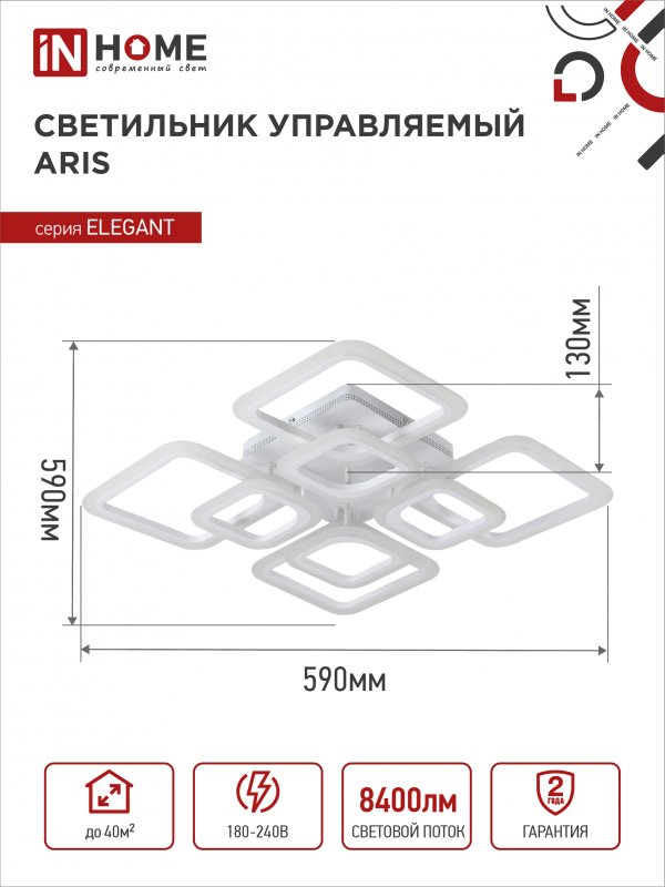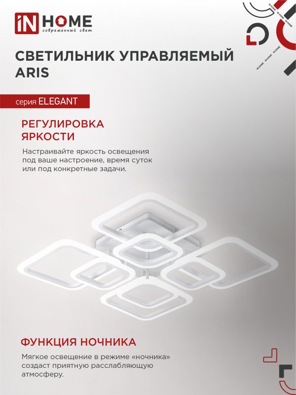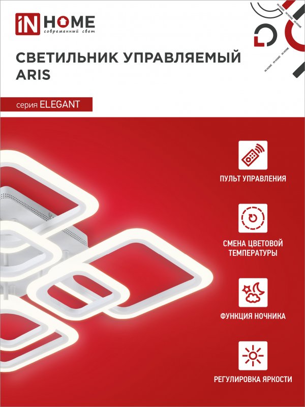 Назначение и применение Светильник светодиодный ELEGANT ARIS-W 120Вт 230В 3000-6500K 8400Лм 590х590х130мм c пультом ДУ белый IN HOME