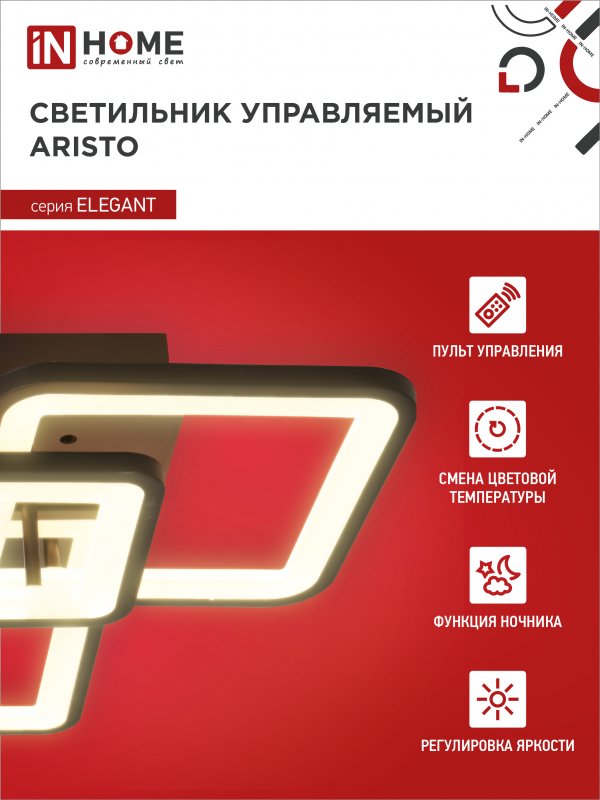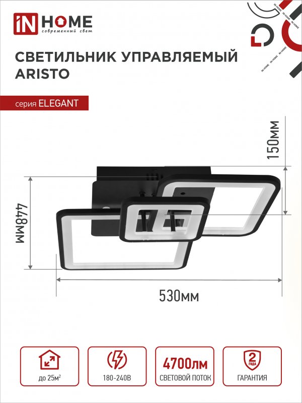 Характеристики Светильник светодиодный ELEGANT ARISTO-B 60Вт 230В 3000-6500K 4700Лм 531х448х151мм пульт ДУ черный IN HOME: