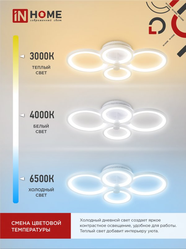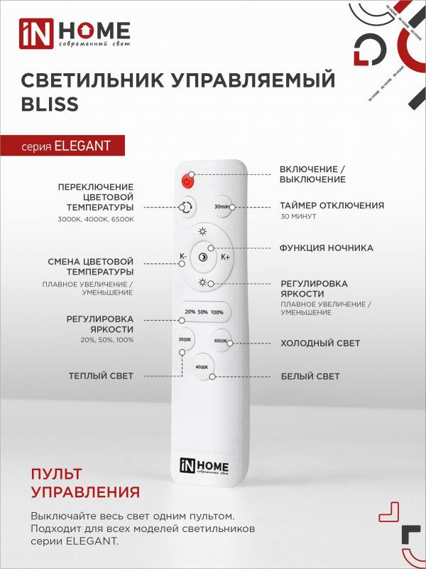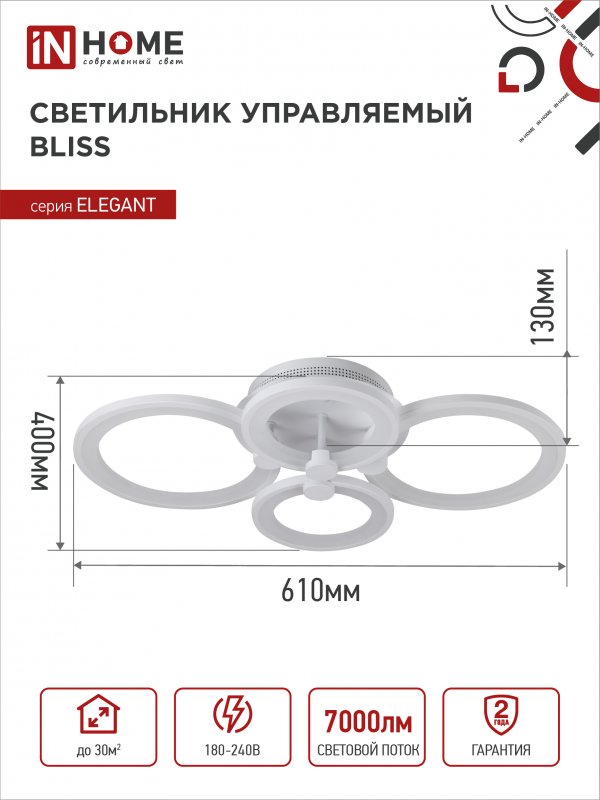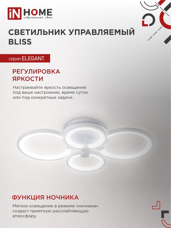 Назначение и применение Светильник светодиодный ELEGANT BLISS-W 90Вт 230В 3000-6500K 7000Лм 610х400х130мм c пультом ДУ белый IN HOME