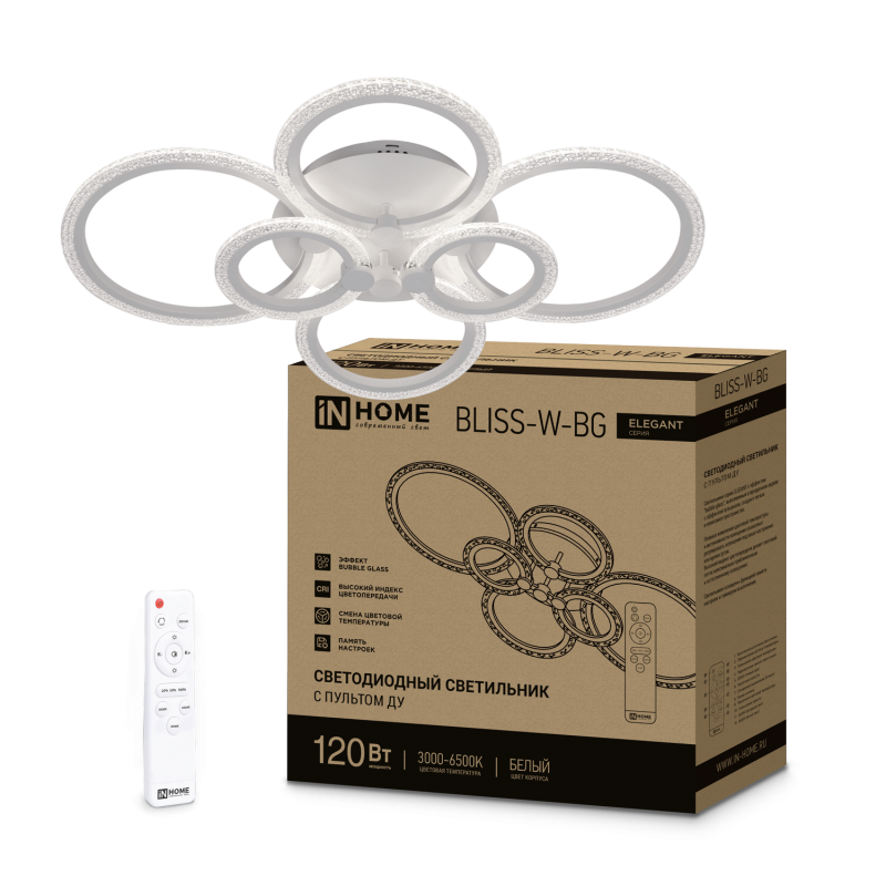 Характеристики Светильник светодиодный ELEGANT BLISS-W-BG 120Вт 230В 3000-6500K 8400Лм 780х550х130мм пульт ДУ белый IN HOME: