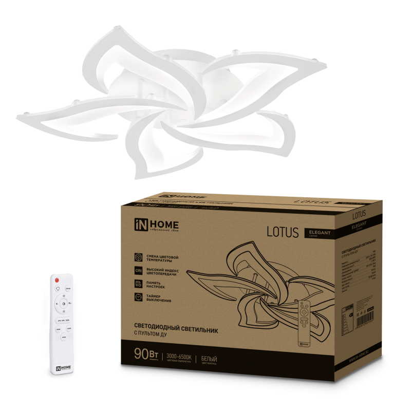 Характеристики Светильник светодиодный ELEGANT LOTUS 90Вт 230В 3000-6500K 7000Лм 590х570х90мм c пультом ДУ белый IN HOME: