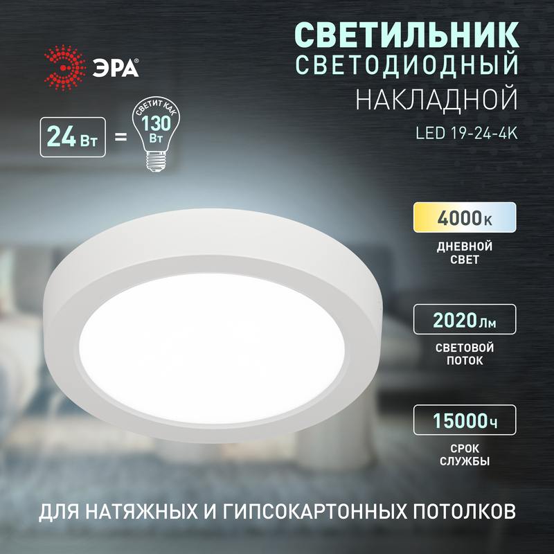 Характеристики Светильник светодиодный ЭРА LED 19-24-4K накладной круглый 24Вт 4000К: