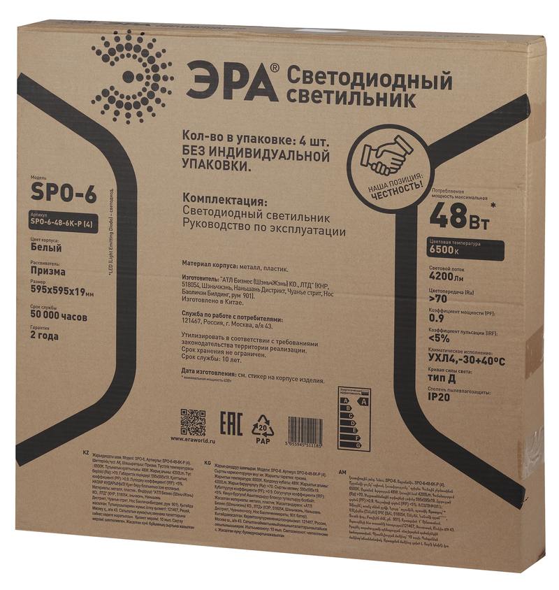 Характеристики Светильник светодиодный ЭРА SPO-6-48-6K-P 48Вт 6500К 4800Лм IP40 595х595х19 призма с проводом:
