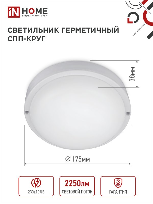 Характеристики Светильник светодиодный герметичный СПП 2565-КРУГ 25Вт 6500К 2250Лм IP65 175мм IN HOME: