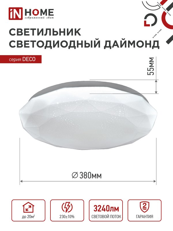 Назначение и применение Светильник светодиодный серии DECO ДАЙМОНД 36Вт 230В 4000К 3240Лм 380х55мм IN HOME