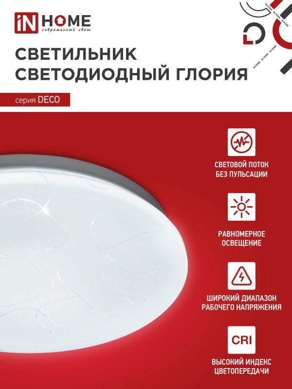 Назначение и применение Светильник светодиодный серии DECO ГЛОРИЯ 36Вт 230В 6500К 3240Лм 380х55мм IN HOME