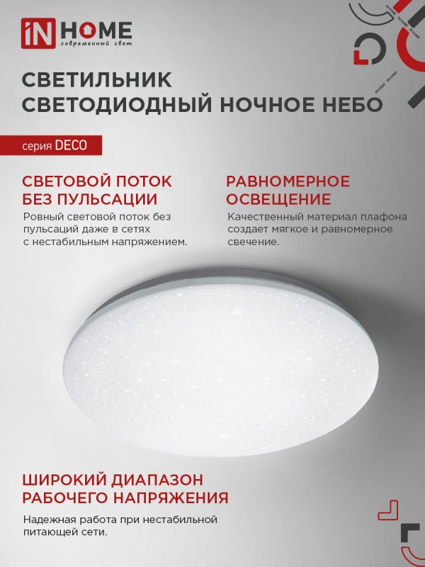 Назначение и применение Светильник светодиодный серии DECO НОЧНОЕ НЕБО 24Вт 230В 4000К 2160Лм 330х55мм IN HOME