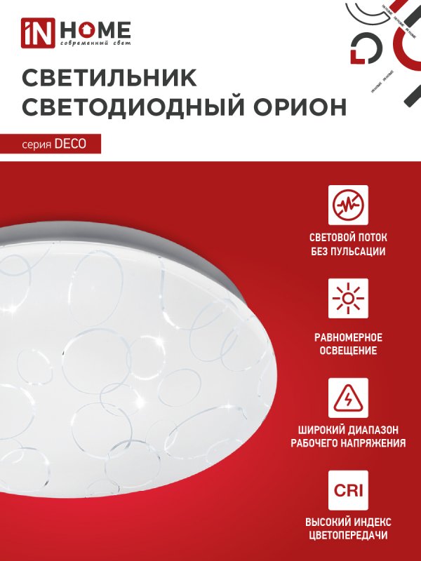 Светодиодный светильник круглой формы ОРИОН серии DECO ТМ IN HOME в классическом белом корпусе с нейтральным абстрактным рисунком удачно впишется в любой современный интерьер. При минимальных затратах электроэнергии светильник обеспечивает яркий, но комфортный для глаз свет и гарантирует отсутствие пульсации. Разнообразие модификаций поможет создать оптимальный вариант интерьерного освещения. Линейка светильников ОРИОН DECO In Home представлена в нескольких вариантах размеров и мощностей (от 12 Вт до 48 Вт), что позволяет подобрать оптимальный осветительный прибор, в зависимости от конфигурации и габаритов помещения
