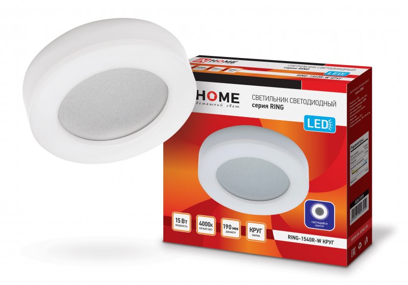 Назначение и применение Светильник светодиодный серии RING-1540R-W 15Вт 230В 4000К 910Лм 190мм IP65 КРУГ IN HOME