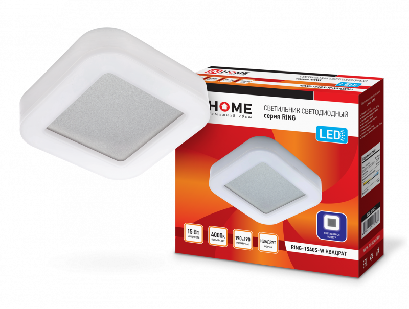 Характеристики Светильник светодиодный серии RING-1540S-W 15Вт 230В 4000К 910Лм 190мм IP65 КВАДРАТ IN HOME: