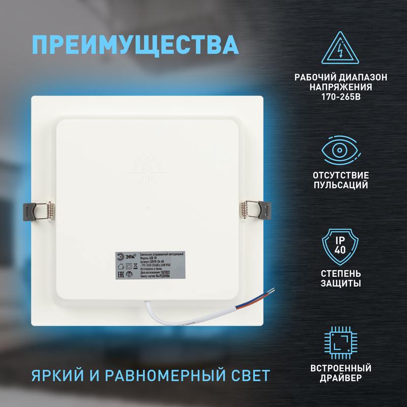 Характеристики Светильник светодиодный встраиваемый ЭРА LED 18-24-6K квадратный 24Вт 6500К: