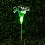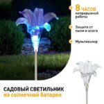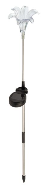 Садовый светильник ЭРА ERASF22-19 (арт. Б0053379) отличает элегантный дизайн в виде прозрачной лилии с разноцветным RGB-светом. Высота уличного светильника — 75 см. Диаметр цветка — 10 см. Солнечная батарея, закреплённая на стойке светильника, накапливает энергию для 8 часов свечения в тёмное время суток. Уличный садовый светильник может применяться в любую погоду, так как отлично защищён от влаги и пыли — IP44. Светодиодная лилия — идеальное дополнение палисадника, клумбы. Яркий разноцветный RGB-светильник уличный в виде цветка хорошо смотрится у фасада дома, у садового пруда, у забора. Особого эффекта можно достичь, купив несколько штук и разместив такие садовые светильники в составе группы.
