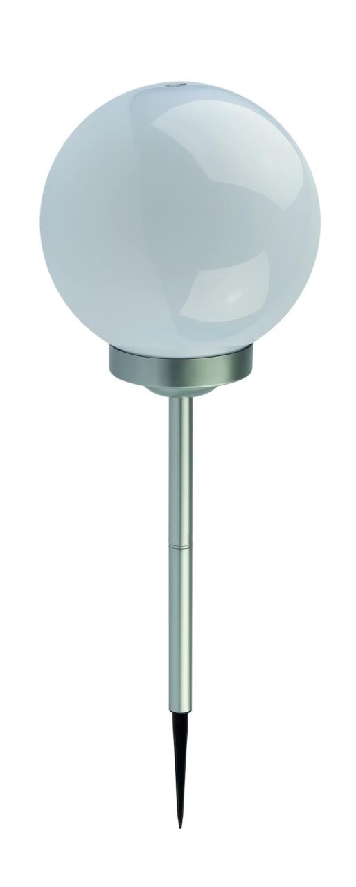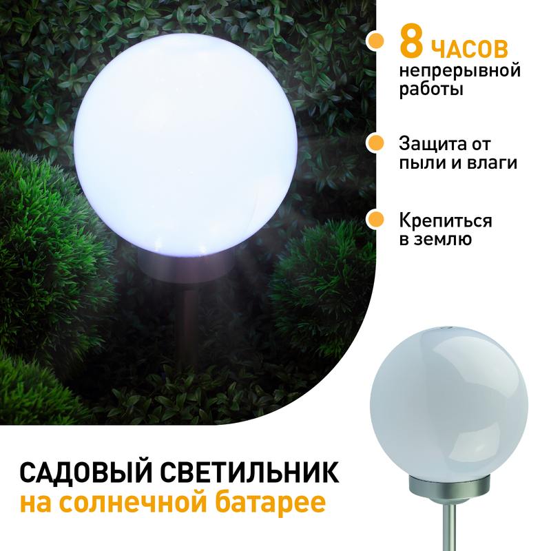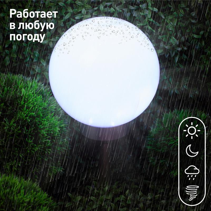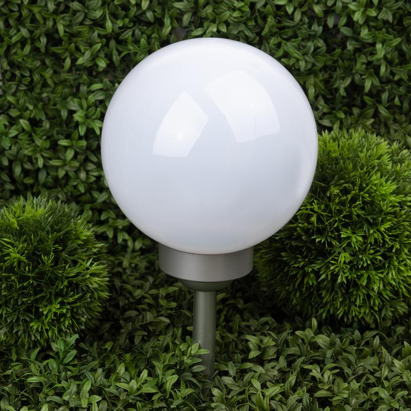 Классическая модель садового светильника в виде сферы. Мягкое свечение холодного белого света послужит прекрасным украшением при оформлении садовых дорожек и клумб.